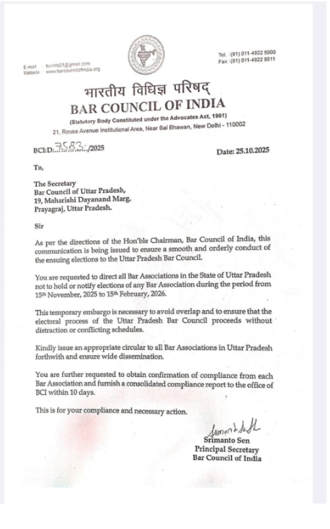BAR COUNCIL OF INDIA : बार काउंसिल ऑफ इंडिया (BCI) का उत्तर प्रदेश बार कॉउन्सिल को निर्देश, BCI ने UP BAR COUNCIL को एक पत्र लिखा हैं. जिसमे कहा गया हैं कि राज्य के सभी जिला और स्थानीय बार एसोसिएशनों के चुनाव 15 नवम्बर 2025 से 15 फरवरी 2026 के बीच स्थगित रखे जाएं.